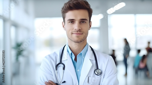 Portrait of young man doctor with stethoscope at bright white hospital room. medical male doctor standing in front of blurred hospital background