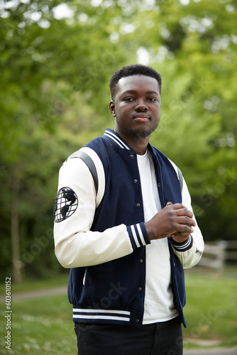 Portrait of young man in baseball jacket