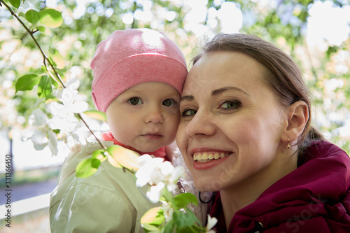 Portrait of young mother and her small daughter in the park full of apple blossom trees in a spring day. Woman and girl in nature landscape