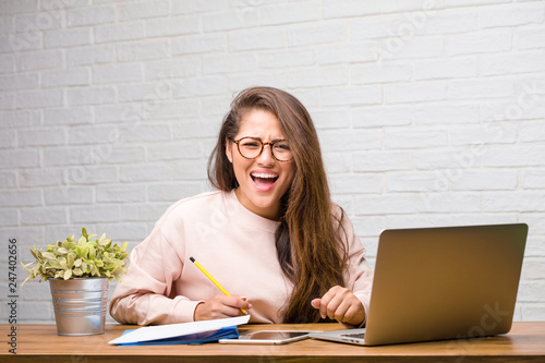 Portrait of young student latin woman sitting on her desk screaming angry, expression of madness and mental instability, open mouth and half-opened eyes, madness concept