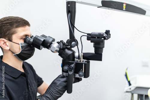 Portrait of young woman patient lying on dentist chair with open mouth. Young female dentist treating caries using microscope at the dentist office. Dentist wearing mask and gloves.