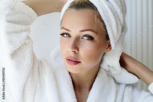 Portrait of young woman wearing white bathrobe standing in the bathroom.Portrait of beautiful girl in bathrobe and with towel on her head