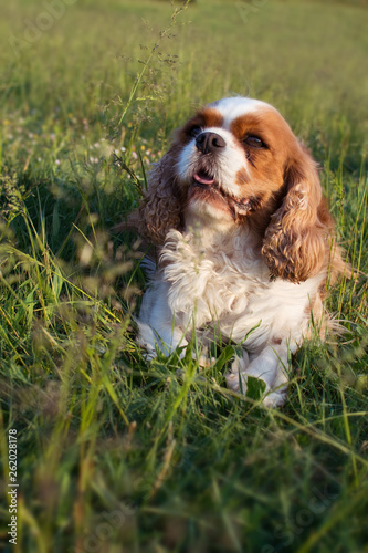 PORTRAIT SMALL CAVALIER KING CHARLES ON GREEN GRASS PARK.