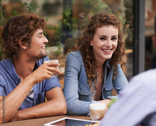 Portrait, woman and friends at coffee shop for fun, conversation and bonding together in Dublin. Happy, female person and smile for playful, discussion and rest and relaxation at outside venue