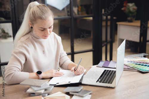 Portrait young woman professional designer develops design of apartment project in workplace laptop