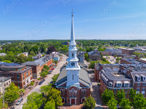 Portsmouth historic downtown aerial view at Market Square with historic buildings and North Church on Congress Street in city of Portsmouth, New Hampshire NH, USA.