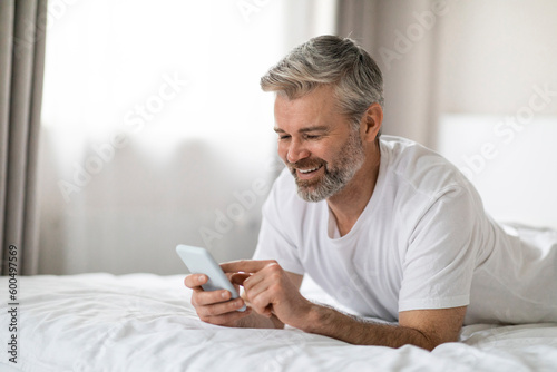 Positive adult man chilling on bed at home, using phone