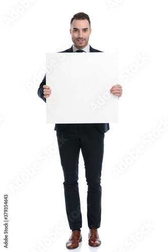 Positive businessman smiling and holding blank billboard