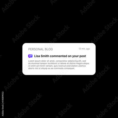 Post Comment Notification Banner Illustration. Personal Blog. Social Media UI Concept on Black Background. Editable Time, Tittle and Text with Speech Bubble Icon. Web Element for Mobile Applications