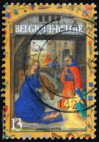Postage stamp Belgium 1995 nativity scene from Breviary, book of devotion, circa 1500, Christmas
