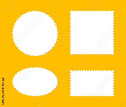 Postage stamp frames template. Circle or oval and rectangular blank vintage stamps. Backdrops for postcards, letters, empty borders. Coupons, tags, label, boxes with wavy, wiggly perforated edges.