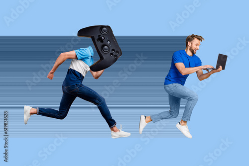 Poster banner collage of two people productive efficient worker run away from procrastination workaholic no relax play games