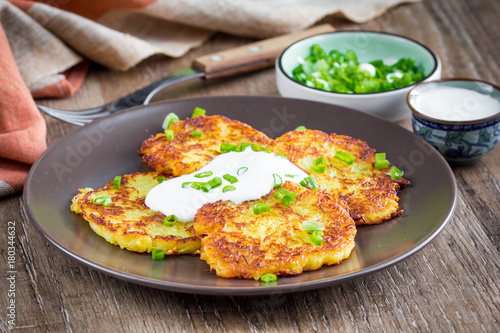 Potato pancakes with sour cream, Ukrainian pellet, a traditional dish, tatsy food