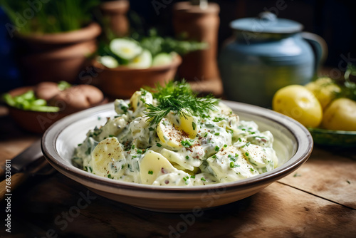Potato Salad, Creamy, tangy side dish with mayo based dressing, with herbs and pickles. Generated AI