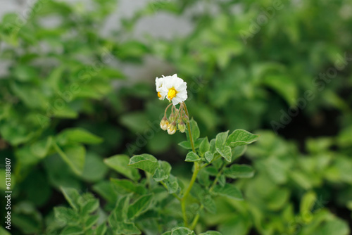 Potatoes growing in urban garden. Flower of potato close up. Home grown food and organic vegetable. Community garden