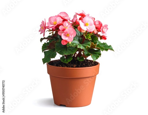 Potted begonia with pink blossoms and green leaves, isolated on a white background