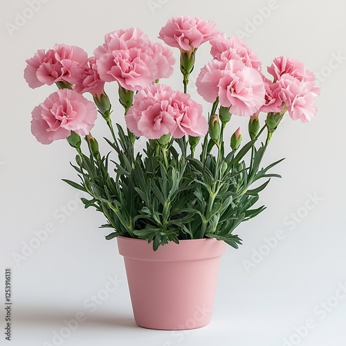 Potted pink carnations a white background bright and fresh clean and vibrant green leaves