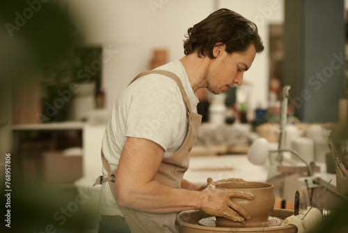 Pottery maker forming a bowl on a wheel with his hands