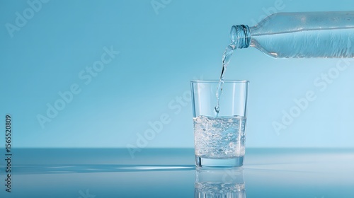 Pouring water from a bottle into a glass on a blue background, with space for text