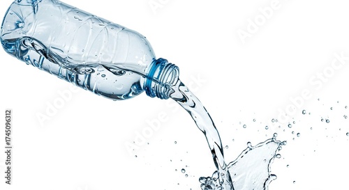 Pouring water from a clear plastic bottle creates a splash and droplets