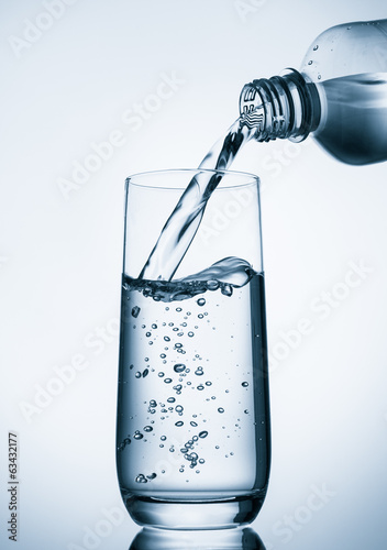 Pouring water into glass from bottle on blue background