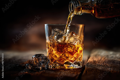Pouring Whiskey into Crystal Glass with Ice on Rustic Wooden Table, Evoking Elegance and Warmth for Advertising Use