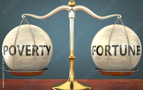 poverty and fortune staying in balance - pictured as a metal scale with weights and labels poverty and fortune to symbolize balance and symmetry of those concepts, 3d illustration