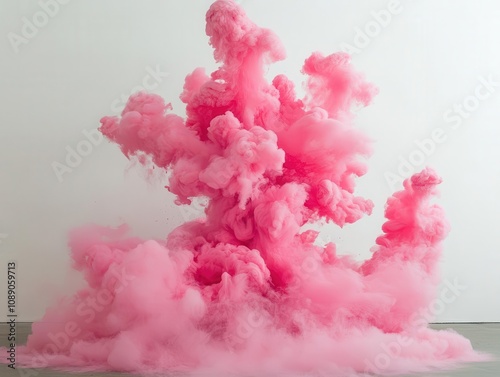 powdery explosion of vivid pink paint, frozen in time, on a pristine white backdrop, evoking energy and celebration with its vibrant hue and dynamic form