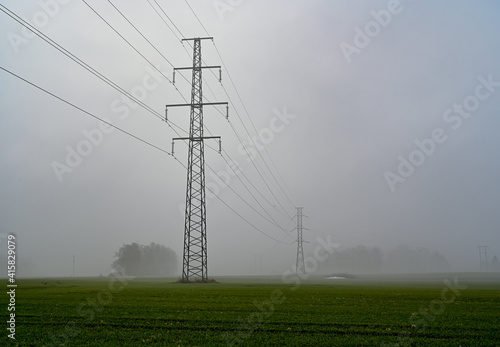 power line over agriculture fields a foggy morning