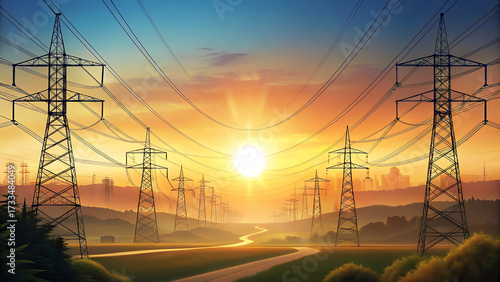 Power lines in sunlight across scenic landscape