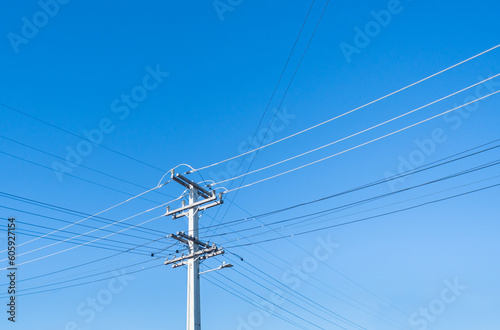 Power post and powerlines against a cloudless blue sky. Auckland.