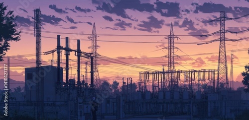 Power station and transmission towers under a colorful evening sky