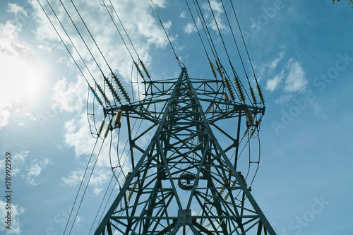 power transmission tower against the blue sky and bright sun
