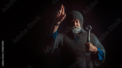 Powerful bearded knight with the sword on the dark background
