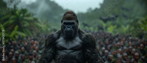 Powerful Gorilla Leading a Massive Army Amidst Lush Green Jungle Landscape
