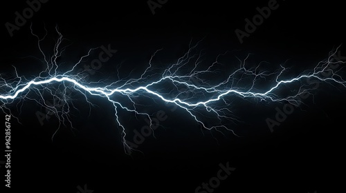 Powerful lightning bolt with branching patterns, isolated on a black backdrop, showcasing the dramatic and electrifying force of nature.