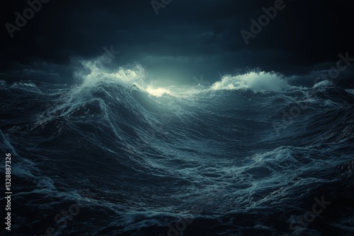 Powerful ocean waves crash dramatically under a dark, stormy sky illuminated by a faint glow