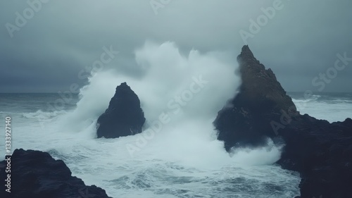 Powerful Ocean Waves Crashing Against Dark Rocks During a Storm