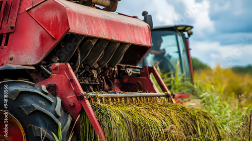 Powerful Red Tractor Harvesting Crops in Autumn Countryside Field