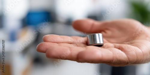 prank gadget concealment, focused on a vintage hand joy buzzer hidden for a handshake against a blurry office backdrop