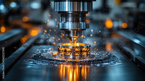Precision machining process with sparks and coolant in a factory.