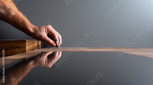 Precision woodworking: hand aligning wooden surface for perfect finish