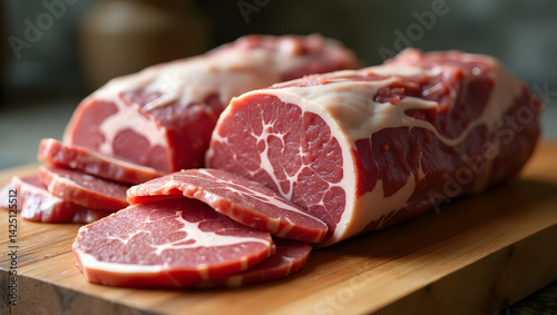 Premium raw meat log expertly prepared and sliced on a wooden board, embodying culinary precision and commercial appeal for high end food presentation