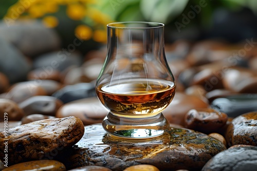Premium Whiskey Glass Close-Up on River Rocks with Natural Background for Posters and Prints