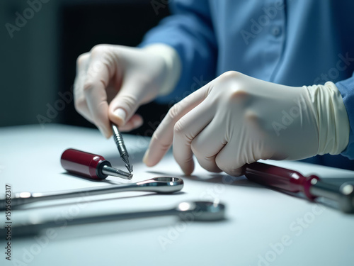 Préparation minutieuse des instruments chirurgicaux stériles avant une opération médicale en salle d’intervention