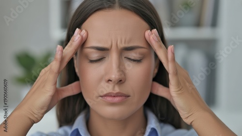 presbyopia woman stress fatigue focusconcept. Woman experiencing stress with hands on her forehead.