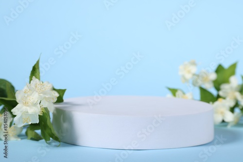 Presentation of product. White podium and beautiful jasmine flowers on light blue background, closeup. Space for text