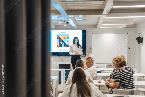 Presenting analytical report at modern conference room. Multicultural group of businesspeople listening to a successful businesswoman giving a speech