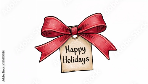 Presenting red bow sketch showing loops and tails on white backdrop, tag 'Happy Holidays' with ring
