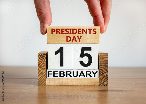 Presidents Day symbol. Male hand puts a block with the words 'Presidents Day' on wooden calendar with the date February 15th. Wooden table. Beautiful white background, copy space. Concept.